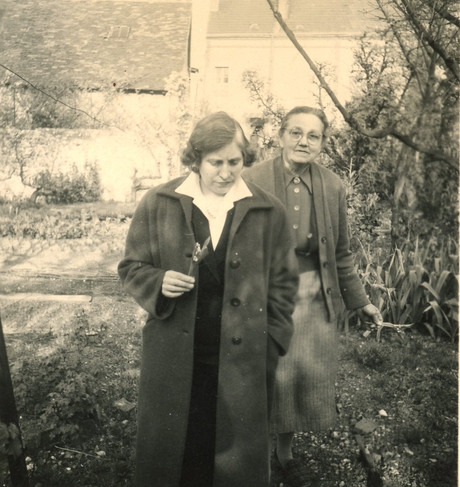 Photo 1 : Madeleine, son fils et son petit-fils aîné, photo 2 : Madeleine et sa petite-fille, photo 3 : Madeleine et sa belle-fille, photo 4 : son dernier petit-fils (ma pomme) dans l'allée des fraises de bois du jardin de Madeleine. Année 1955 ou 1956.